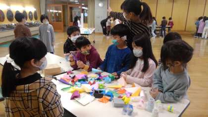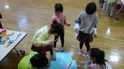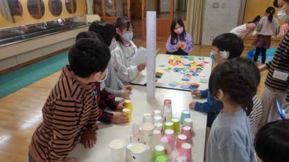 2年生のおもちゃの遊び方の説明がとても上手で、1年生は楽しそうに遊んでいます。
