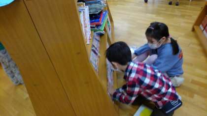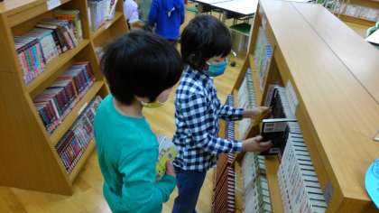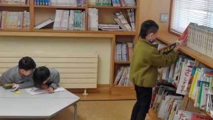 読書タイムに読む本を選んでいます。選んでいる途中に、読みふける子供もいます。