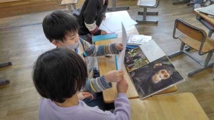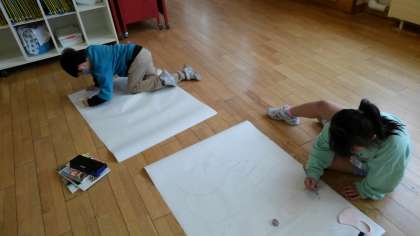 いろいろな動物の紹介をするために大きな紙に絵を描いたり、クイズを作ったりしています。