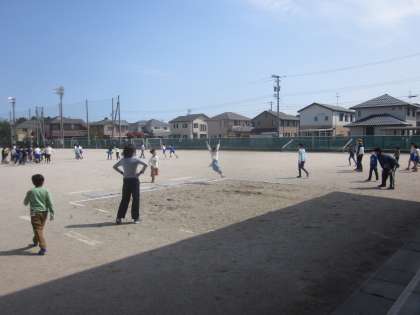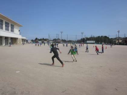 今日から大休憩の時間を使って、体力つくり活動をスタートしました。走(鬼ごっこ)跳(走り幅跳び)投(ボール投げ)に分かれて活動します。子供たちと一緒に先生たちも活動します。