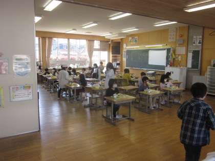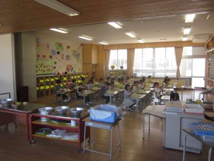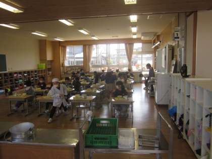今日は「ごはん、牛乳、鯖の塩焼き、大根サラダ、すき焼き、バナナ」です。子供たちは静かに、よくかんで食べています。