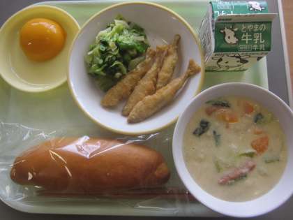 今日の献立は「米粉コッペパン、牛乳、ワカサギのフリッター、グリーンサラダ、クリーム煮、ももかん」です。