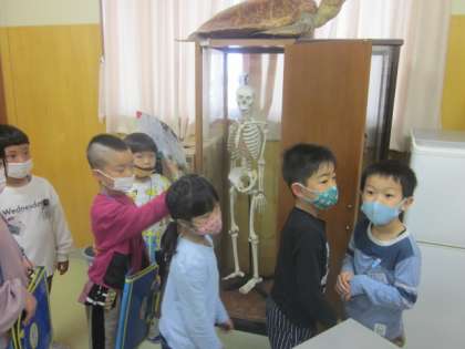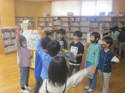 2年生さんに、学校の中を探検に連れて行ってもらいました。初めて行ったところや見たものに目を輝かせていました。2年生さんが考えたクイズに挑戦したりゲームをしたりして仲良く活動しました。今度は、1年生だけで小学校の「すてき」を見つけに行きます。