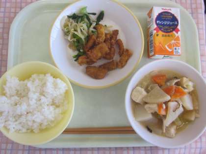 今日の献立は「ごはん、オレンジジュース、いかのかりんあげ、もやしのおひたし、豚肉と大根のごま味噌煮」でした。