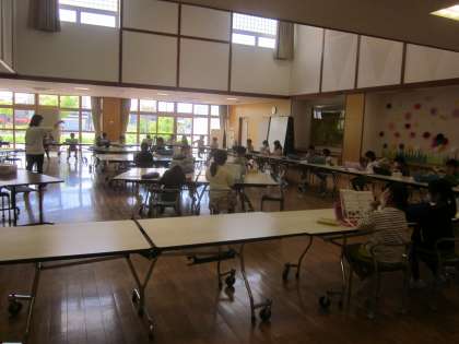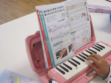 今日は広いランチルームで鍵盤ハーモニカの練習をしました。給食室の横なのでとてもいいにおいがしました。においに負けずにがんばって演奏しました。