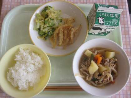 今日の献立は「ごはん、牛乳、しろえびの米粉揚げ、合わせ和え、肉じゃが」でした。今日もおいしくいただきました。