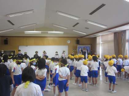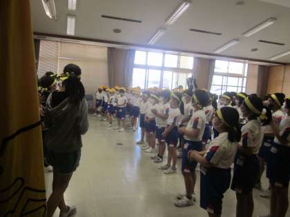 視聴覚室で練習しました。太鼓の音に合わせてリズムよく動くことができました。