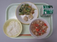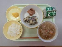 今日の献立は「ごはん、牛乳、豚肉と昆布の甘辛煮、ゆでブロッコリー、中華スープ、甘夏みかん」でした。