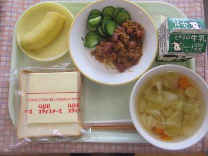 今日の献立は「食パン、牛乳、チリコンカン、きゅうりもみ、キャベツスープ、バナナ、スライスチーズ」でした。