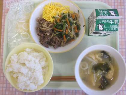 今日の献立は「ご飯、牛乳、ビビンバ(焼肉、ナムル、錦糸たまご)、味噌汁、冷凍ラフランス」でした。