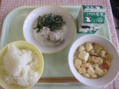 今日の献立は「ご飯、牛乳、チンズワンズ(餅米シュウマイ)、よごし、エビと豆腐のうま煮」でした。