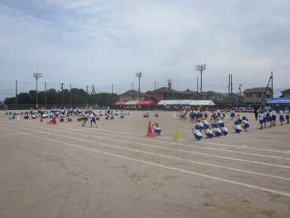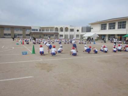 1・2年生のタグ鬼ごっこです。はちまきやタグを取られないように上手に相手をよけながら走りました。