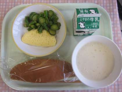 今日の給食は「米粉コッペパン、牛乳、オムレツ、グリーンサラダ、ビーンズポタージュ」でした。