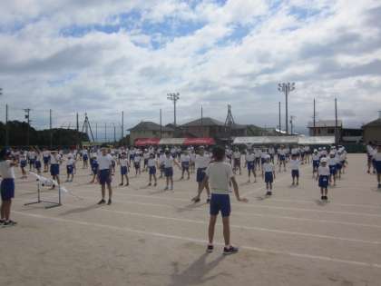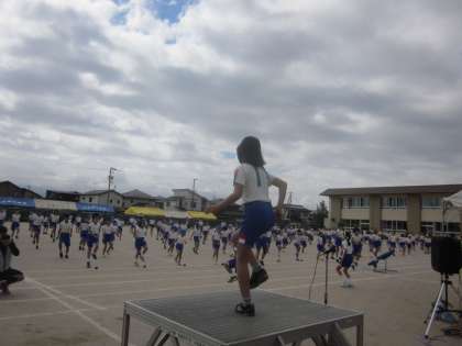 運動委員会の子供たちが前に立ち、見本を見せています。素敵な空です。