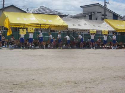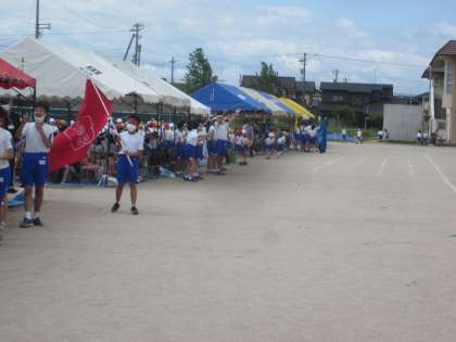 競技のない子供たちは団席でマスクを着けて応援をしています。