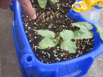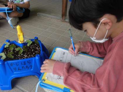 生活科で育てている、あさがおの芽がでてきました。毎日、様子を気にかけて水やりをしています。じっくりと観察をして、生長の記録を書きました。花が咲くのが楽しみですね。
