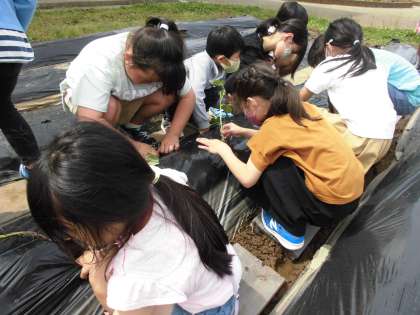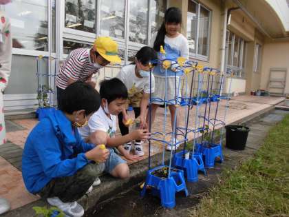 子供たちは、毎朝学校に来るとすぐに自分の野菜の様子を観察したりお世話をしたりしています。「花が咲いている!」「もうすぐ実がなりそう!」と嬉しそうな表情で報告してくれます。畑に植えたさつまいもも、大事に育てていきましょうね。