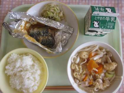 今日の献立は「ご飯、牛乳、かしわうどん、さばの銀紙焼き、甘酢和え」でした。