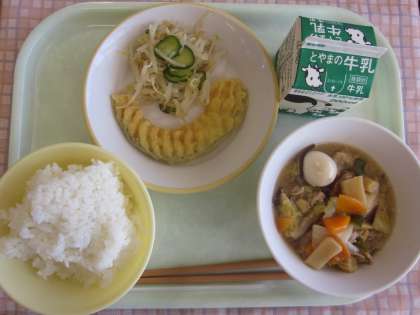 今日の献立は「ご飯、牛乳、八宝菜、カボチャの天ぷら、甘酢和え」でした。