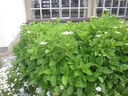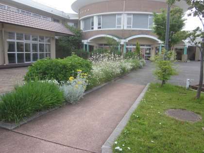 正面玄関のランチルーム側の花壇です。4月は枯れ草にしか見えなかったのですが、現在はいろいろな花がとてもきれいに咲いています。
