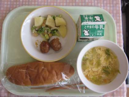 今日の献立は「米粉コッペパン、牛乳、たまごとレタスのスープ、ひよこ豆のオリーブ炒め、ミートボール」でした。