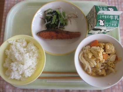今日の献立は「ご飯、牛乳、魚の竜田揚げ、ゆかり和え、親子煮」でした。