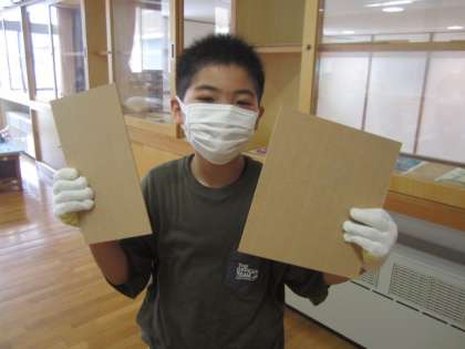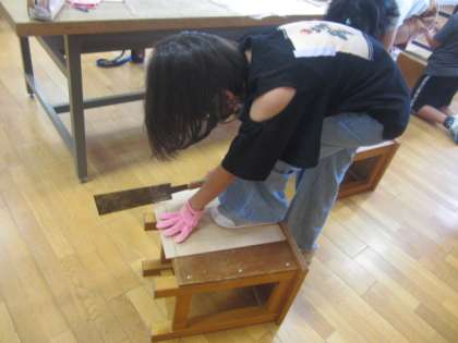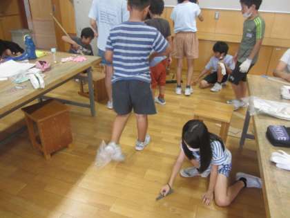 のこぎりを使って工作しています。正しい使い方を意識しながら慎重に扱っていました。最後にみんなで木くずの後片付けまできちんと行うことができました。