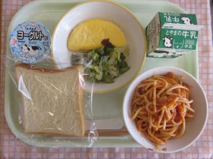 今日の献立は「食パン、牛乳、ツナとトマトのスパゲッティ、オムレツ、海藻サラダ、ヨーグルト」でした。