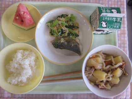 今日の献立は「ご飯、牛乳、肉じゃが、鰆の塩焼き、ハリハリ和え、スイカ」でした。