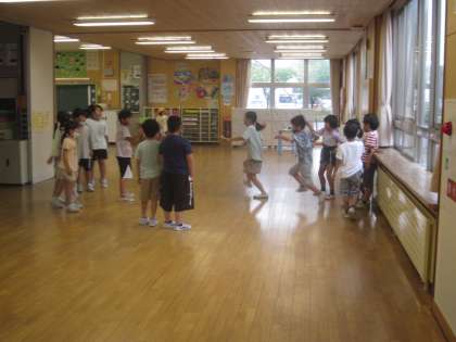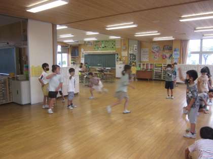 2年生の子供たちが朝から仲よく長縄跳びをしていました。
