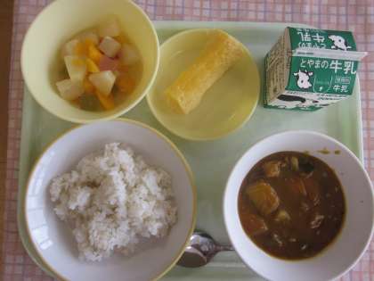 今日の献立は「麦ご飯、牛乳、夏野菜カレー、たまごロール、フルーツカクテル」でした。