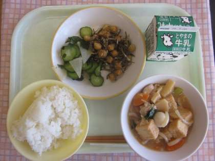 今日の献立は「ご飯、牛乳、厚揚げの中華煮込み、小魚入りフライビーンズ、酢の物」でした。