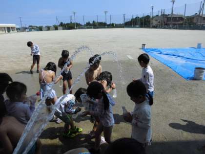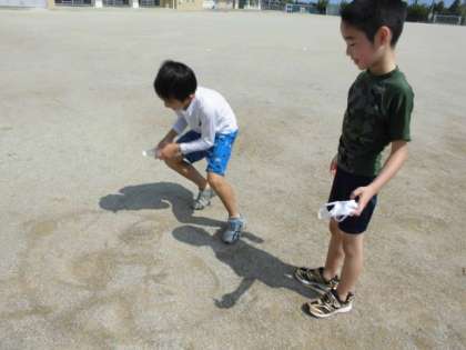 生活科「なつだあそぼう」の学習で、水遊びやシャボン玉をして遊びました。容器に水を入れて遠くまで飛ばしたり、グラウンドに水で絵を描いたりして楽しみました。梅雨が明け、天気がよくなり、子供たちは嬉しさいっぱいで体を動かして遊びました。