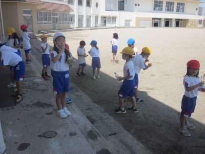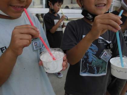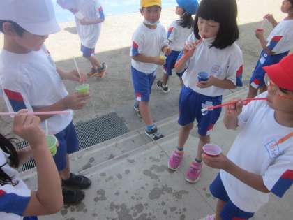 シャボン玉では、カップに息を吹き込むと泡が膨れあがることに気付き、「ソフトクリームだ。」「ブドウみたい。」と楽しんでいました。