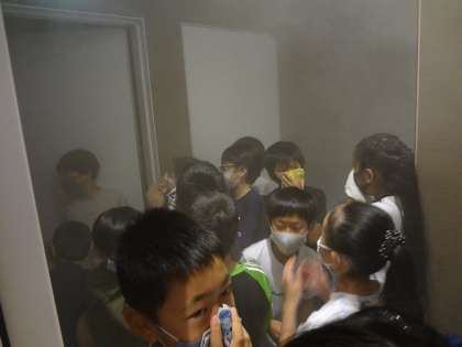 火災の際の煙体験中です。