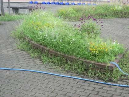 1学期に植えた様々な花苗は順調に育っています。それとともに雑草も順調に育っています。今週は各学級で除草を行っています。写真左は除草前、右は除草後です。とてもきれいになりました。