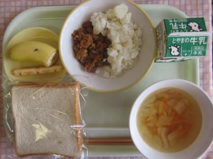 今日の献立は「食パン、牛乳、チリコンカン、粉ふきいも、野菜スープ、バナナ、棒チーズ」でした。