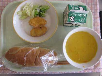 今日の献立は「コッペパン、牛乳、チキンナゲット、フレンチサラダ、かぼちゃポタージュ」でした。