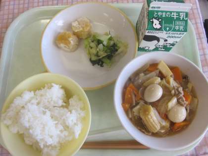 今日の献立は「ご飯、牛乳、八宝菜、人参シューマイ、小松菜ひたし」でした。今日もすっきりと食べました。