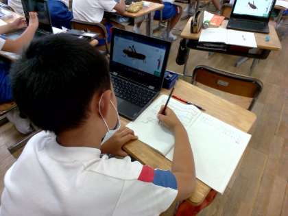 クロムブックを使って、インターネットに載っている昆虫の画像を見ながら観察しています。