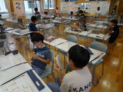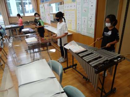 音楽科「リボンのおどり」の学習では、リコーダー、木琴、鉄琴、タンブリン、小太鼓を用いて曲を演奏しました。子供たちは、友達が奏でる音を感じ取りながら、リズムに合わせて楽しんでいました。