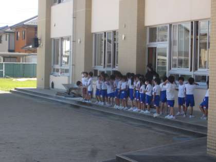 1年生は国語科で「ヤッホー」という文章を学習しています。今日はグラウンドに向かって、大きな声で叫んでみました。