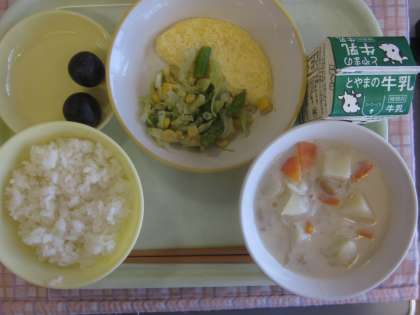 今日の献立は「ご飯、牛乳、オムレツ、アスパラサラダ、白いんげん豆のシチュー、巨峰」でした。