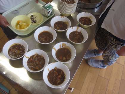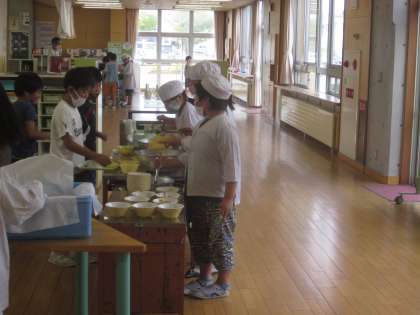 2年生の給食配膳の様子です。順番を守って給食を取っています。