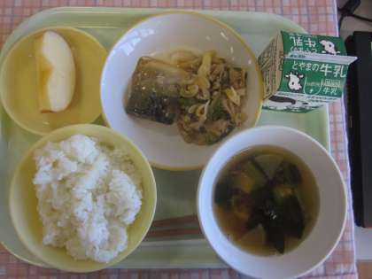 今日の献立は「ご飯、牛乳、鯖の味噌煮、マコモタケのオイスターソース炒め、きのこ汁、りんご」でした。