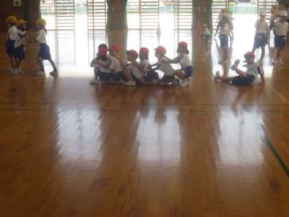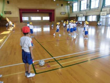体育科「いもむしキックベース」は、ボールを蹴って1塁のコーンを回り、ホームに戻って来たら点数が入ります。その間に、守備はボールを捕った人の後ろに、いもむしのように並びます。全員が並んだら走者は走るのをストップします。走るのが速いか、並ぶのが速いか。子供たちなりに作戦を考えて、勝つために一生懸命です。
