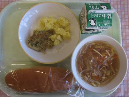 今日の献立は「米粉コッペパン、牛乳、鱈の香草焼き、チームおさつ、春雨スープ」でした。