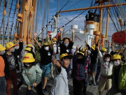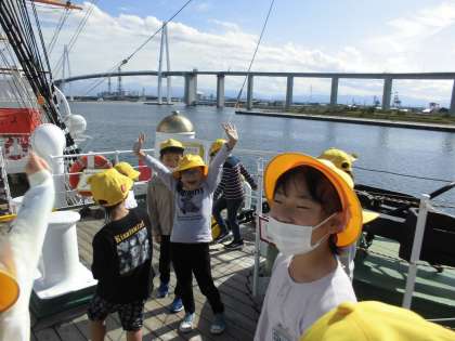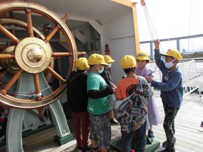 海王丸に乗船しました。子供たちは船長や乗組員になりきっていました。船から見える新湊大橋が、とてもきれいでした。