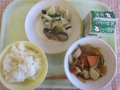 今日の献立は「ご飯、牛乳、大根と鶏肉のうま煮、いわしの生姜味、かぶの彩り」でした。