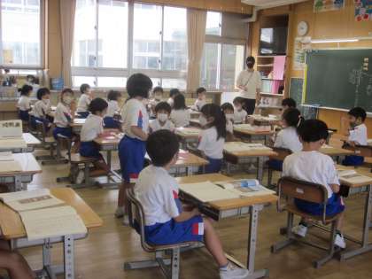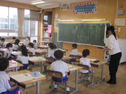 1年生の国語科です。友達の話を目をつないで、しっかりと聴いています。